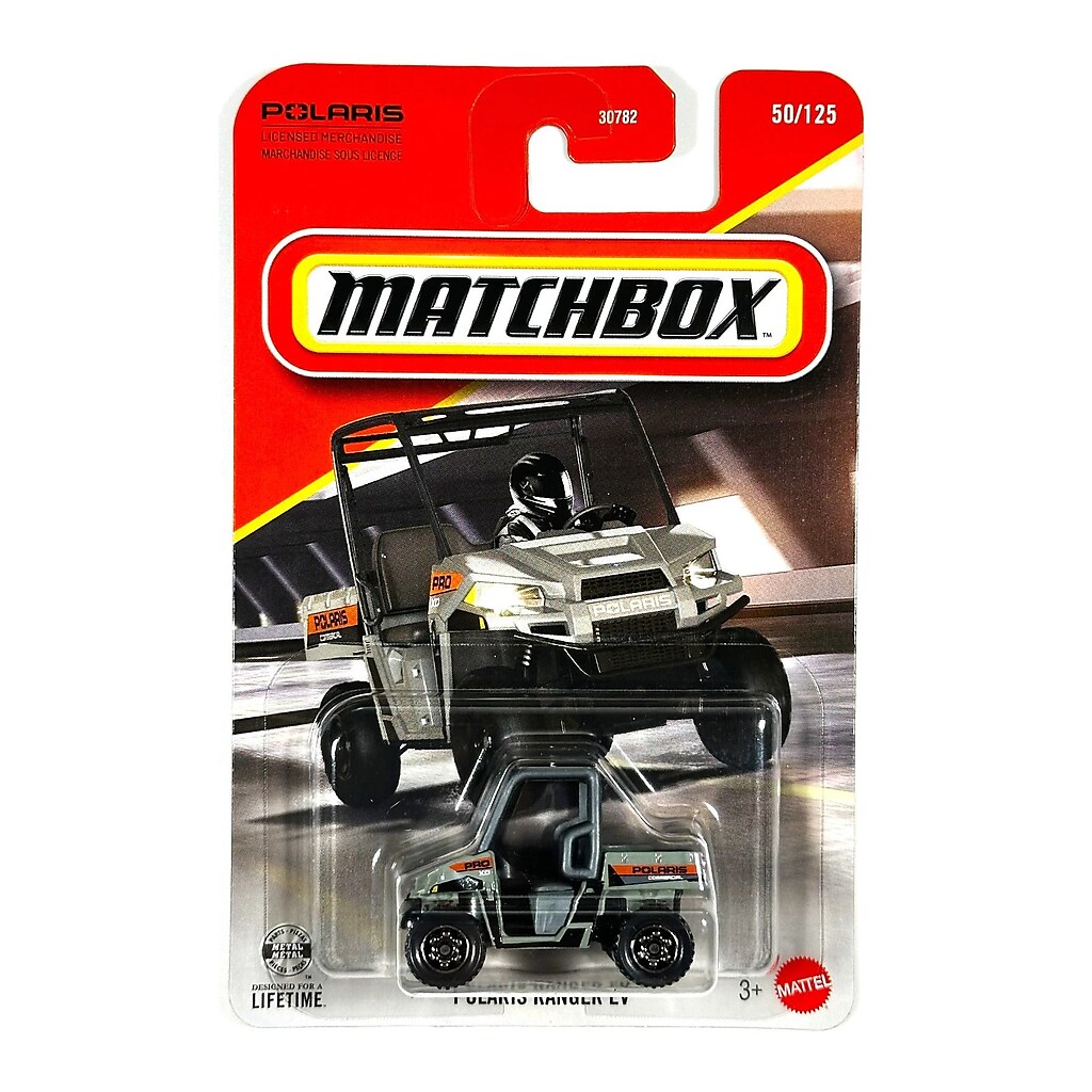 Miniatura Matchbox Mainline 2020 Polaris Ranger EV, escala 1:64 da série MBX Showroom. Com pintura de qualidade e detalhes realistas, é uma peça que valoriza qualquer coleção e encanta fãs de carros da Polaris